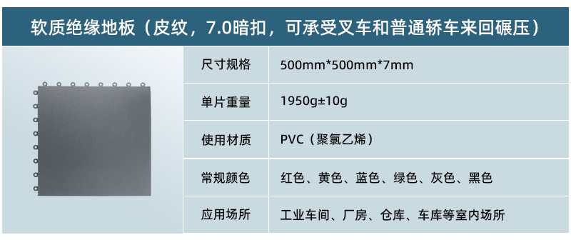 5、高承載,更防滑: 軟質(zhì)絕緣地板為實(shí)心結(jié)構(gòu),只要地面承重沒(méi)有問(wèn)題,其承載能力能夠達(dá)到每平米10噸以上。地板表面在生產(chǎn)過(guò)程中帶有凸起的紋路,讓車(chē)間地面更為防滑。